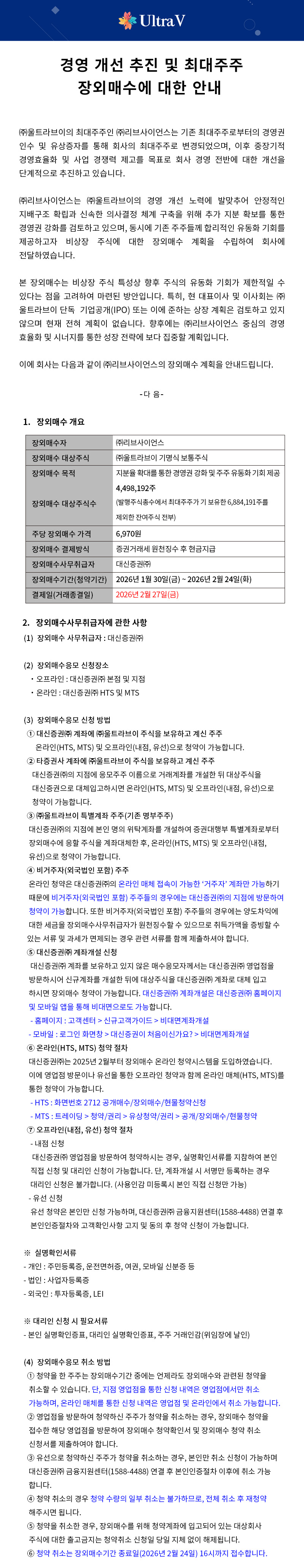 [공지] 경영 개선 추진 및 최대주주 장외매수에 대한 안내